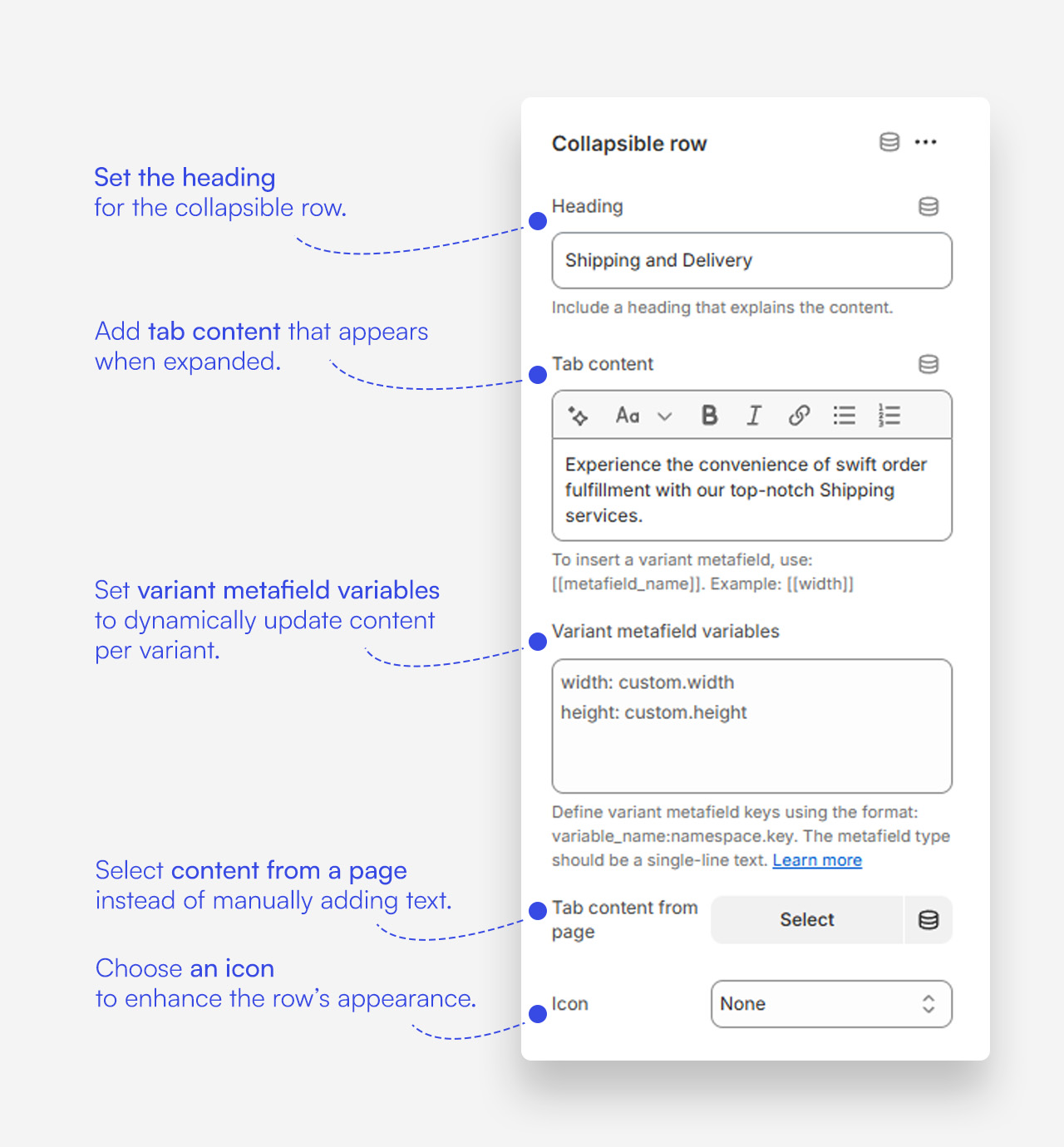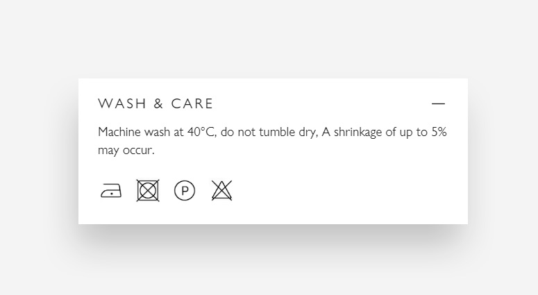 Keep your product pages sleek and informative with our Collapsible Tab section. Add a clear heading like 'Wash & Care' to summarize content for easy navigation. Within the tab, detail care instructions to help customers maintain the quality of their purchase. For more extensive guidelines, link directly to a dedicated page. Enhancing usability, consider adding an icon to draw attention to these essential care instructions, ensuring your customers have all the information they need at a glance.