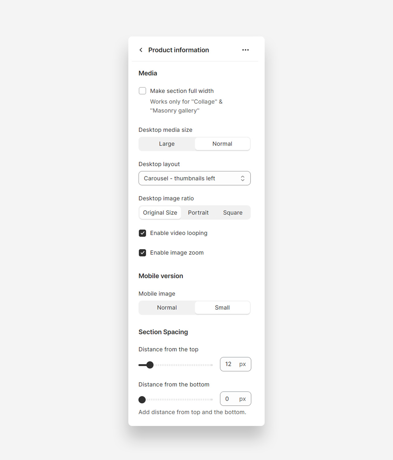 - Enable Video Looping : Activate continuous play for your product videos, ensuring they loop seamlessly on your page.