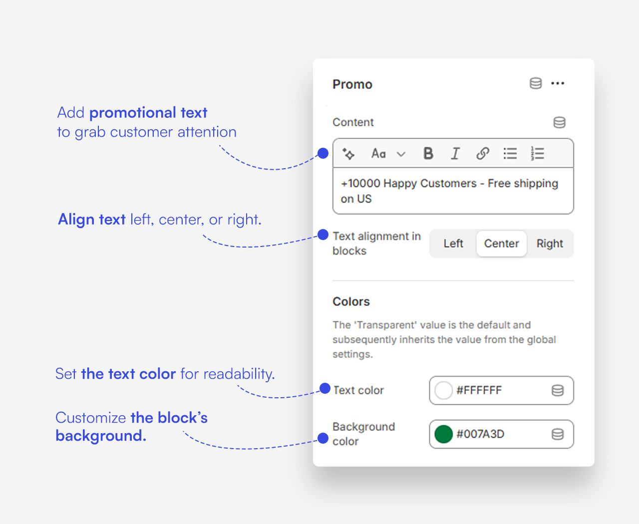 The Promo Block is a simple yet effective way to highlight key promotional messages across your store. Whether it’s free shipping, limited-time offers, or customer milestones, this block helps grab attention with bold text and customizable styling. With options to adjust text alignment, colors, and background, you can seamlessly integrate promotional messages into your store’s design, enhancing customer engagement and trust.
