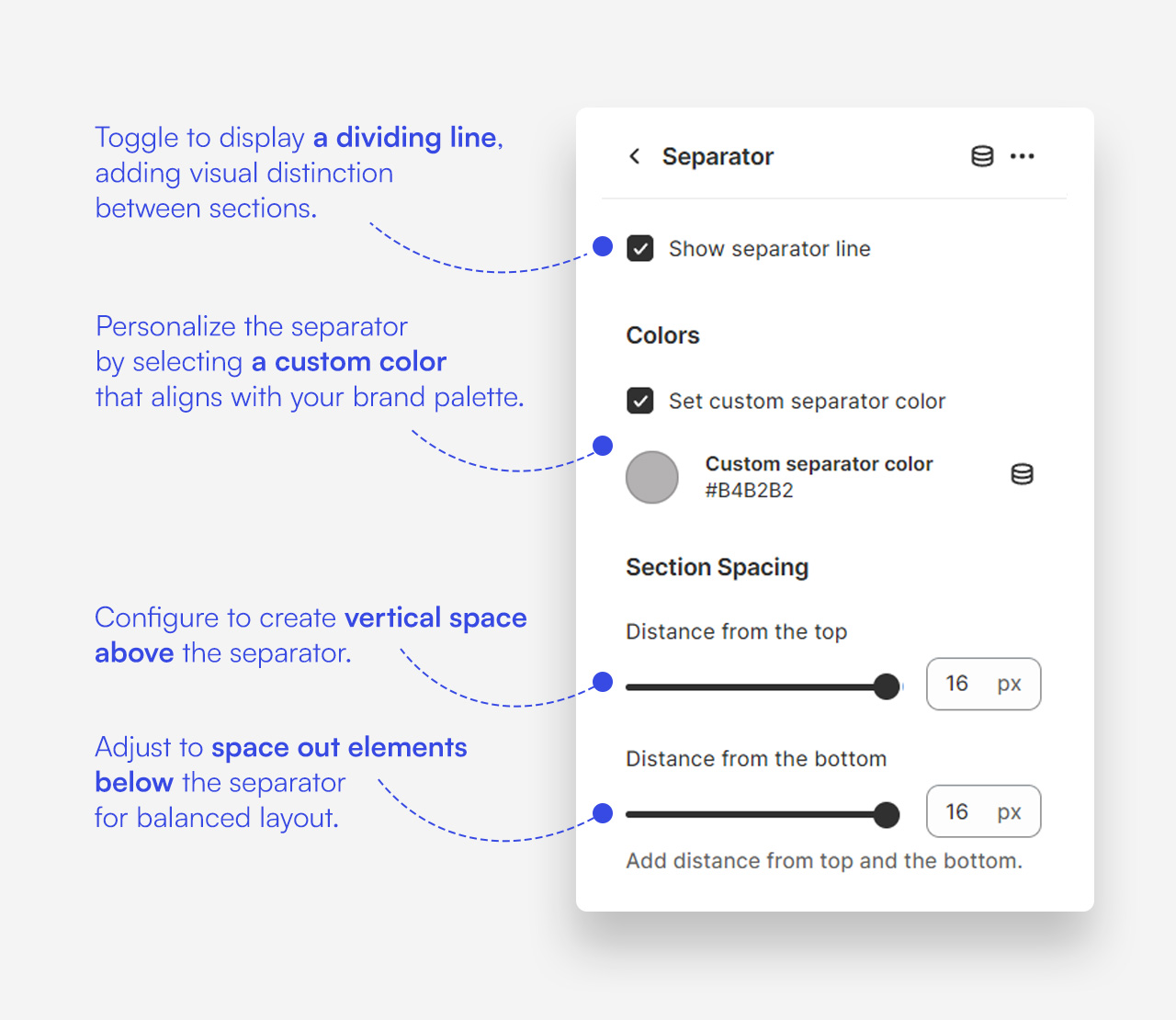 Enhance your Shopify page layout with a customizable separator block. Add a dividing line to distinguish between content sections, select a color that matches your brand, and adjust the vertical spacing for a clean, organized appearance.