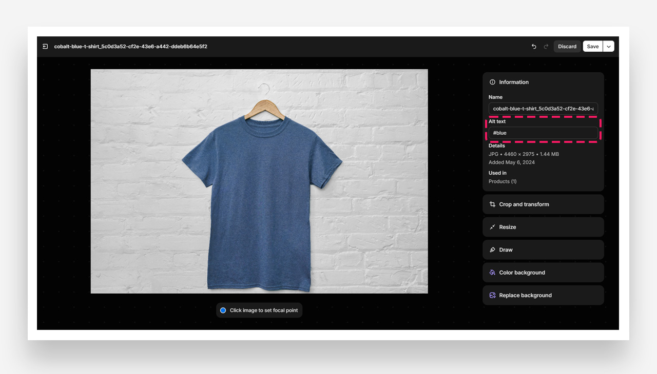 - Set the Alt Tag : In the media details, find the Alt Text field, and enter the variant name prefixed with #, such as #red for the Red variant.