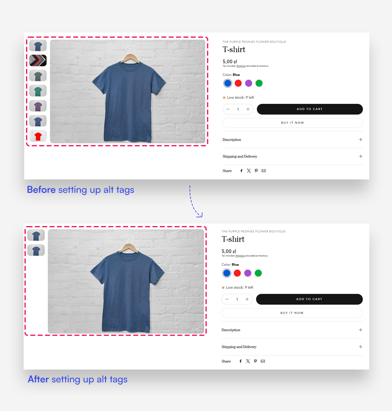 To enable image filtering by variant, each image must have an alt tag matching the variant’s name. For example, if you have a “Red” variant, set the alt tag of each corresponding image to #red . This process is not case-sensitive, so tags like #RED , #ReD , and #red will all work seamlessly.