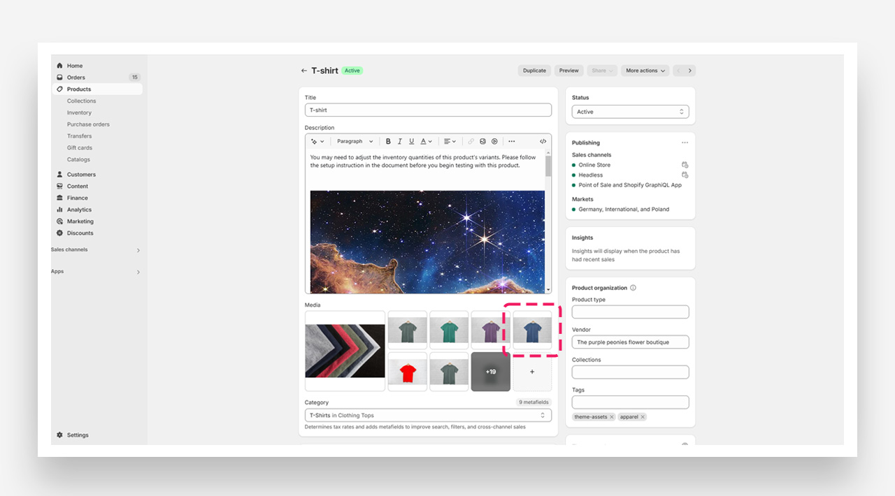 Access the Product in Shopify Admin : Go to your Shopify admin panel and select the product for which you want to set up the multi-variant gallery.