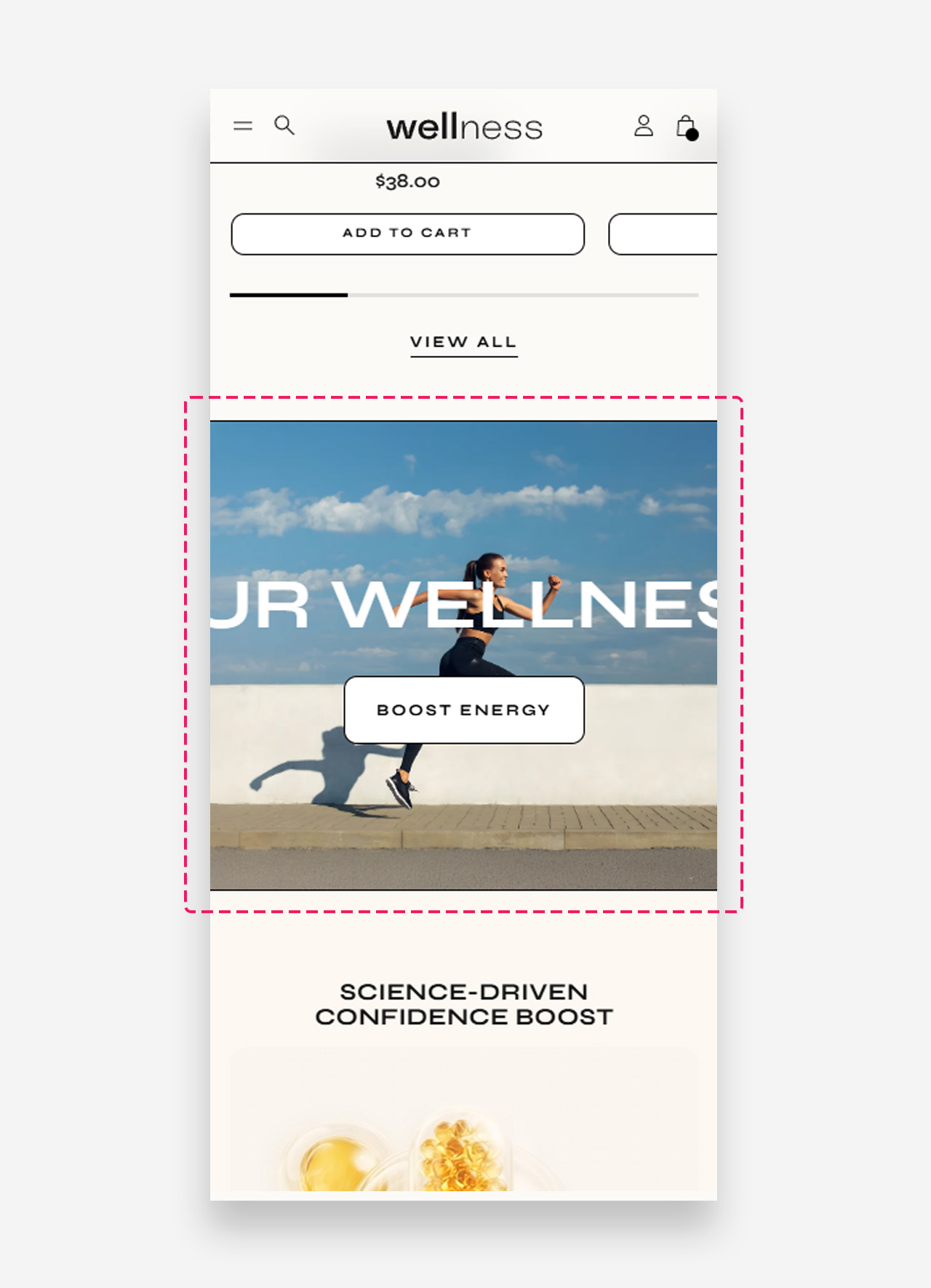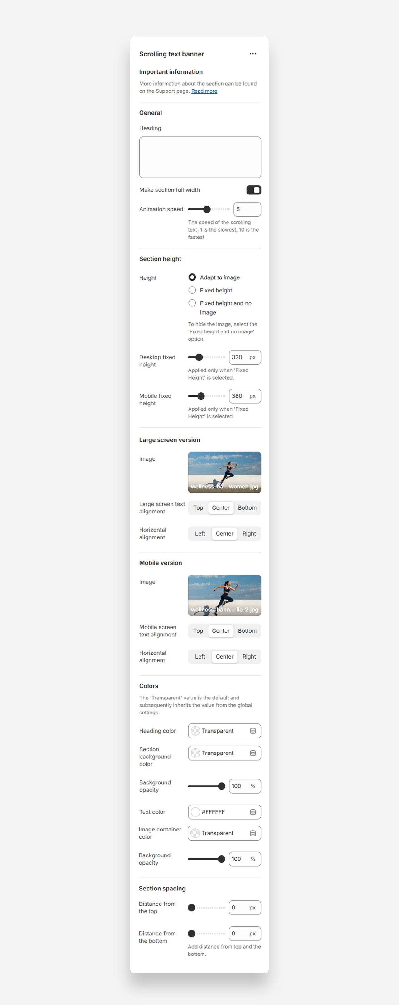 The Scrolling Text Banner section offers a dynamic and visually engaging way to showcase your content. This section features separate images for desktop and mobile, but its standout feature is the scrolling text overlay, which creates a sleek animated effect. You can disable the background image for a minimalist look and focus solely on the text animation. With customizable animation speed and an optional call-to-action button, this section provides versatile options to grab attention and convey your message effectively.