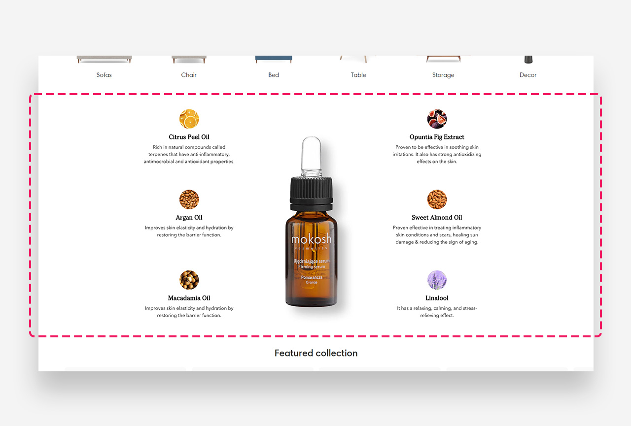 The Benefits Product section is crafted to showcase your products in a visually elegant and informative way. This feature allows you to add high-quality images optimized for both mobile and desktop views, ensuring your product presentation is clear and attractive across all devices. You can set up to 6 benefit blocks to highlight key product features, each accompanied by an icon or image of your choice. On mobile, these benefits are displayed in a streamlined column format, enhancing readability and user engagement.