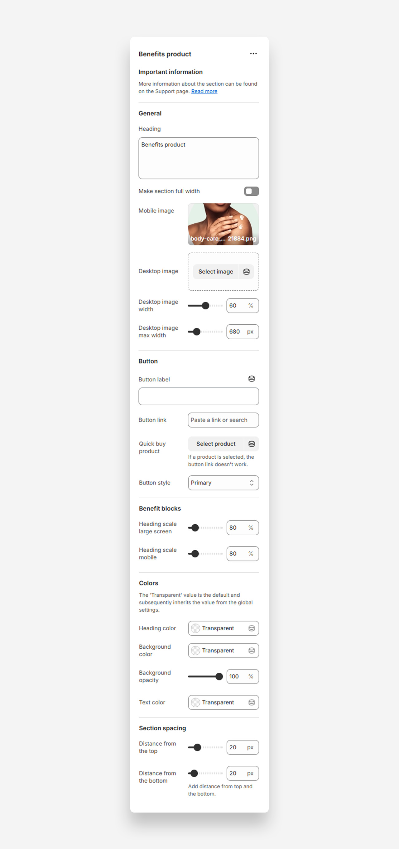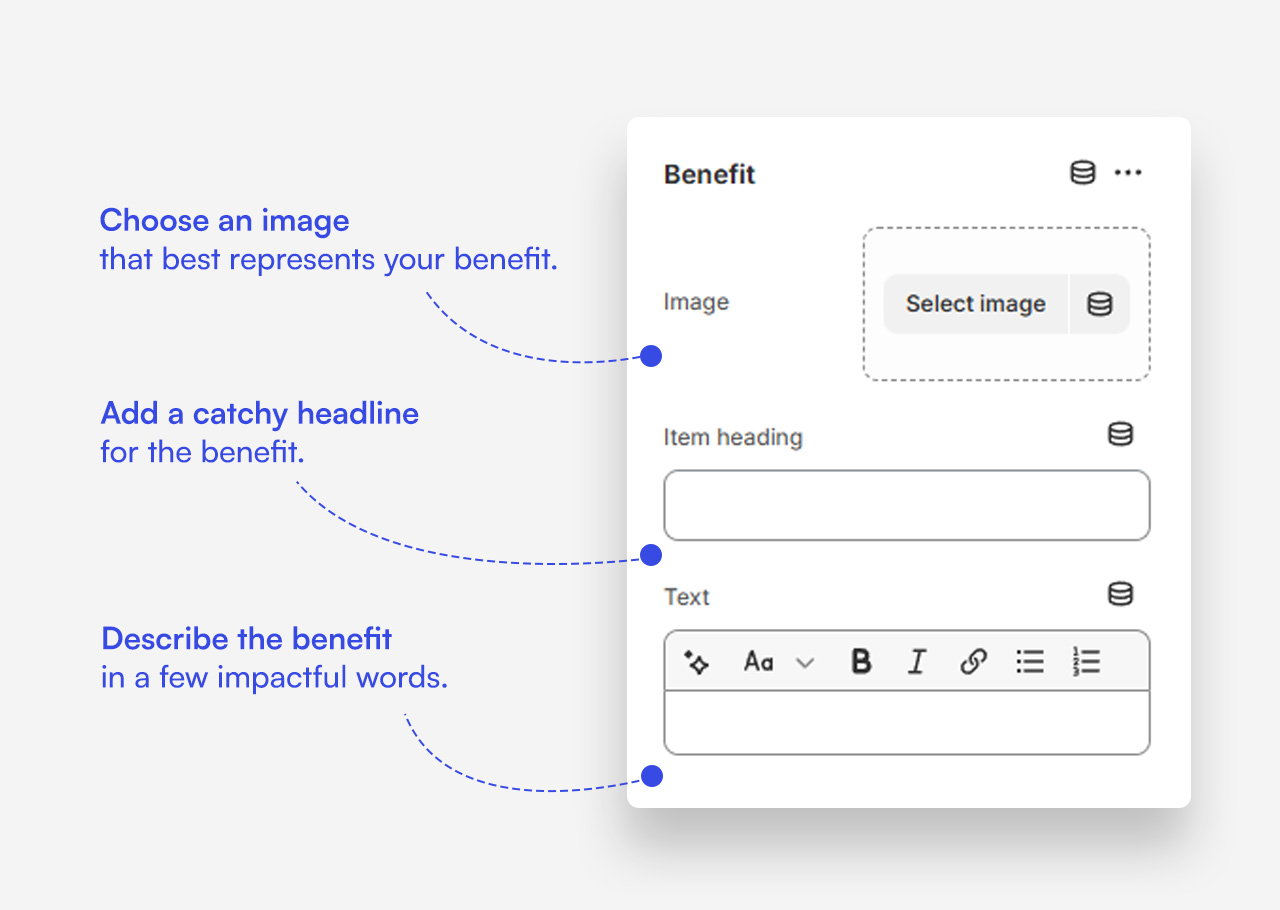 - Heading : Enter the main title for the Benefits Product section.