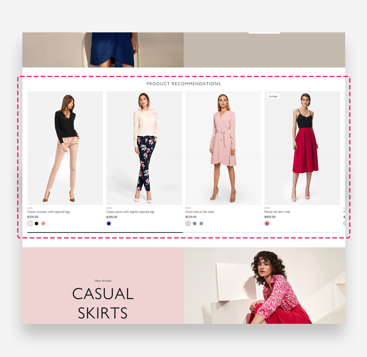The Product Recommendations Section is a curated showcase designed to enhance the shopping experience by suggesting items that complement the customer's current browsing or previous purchase history.