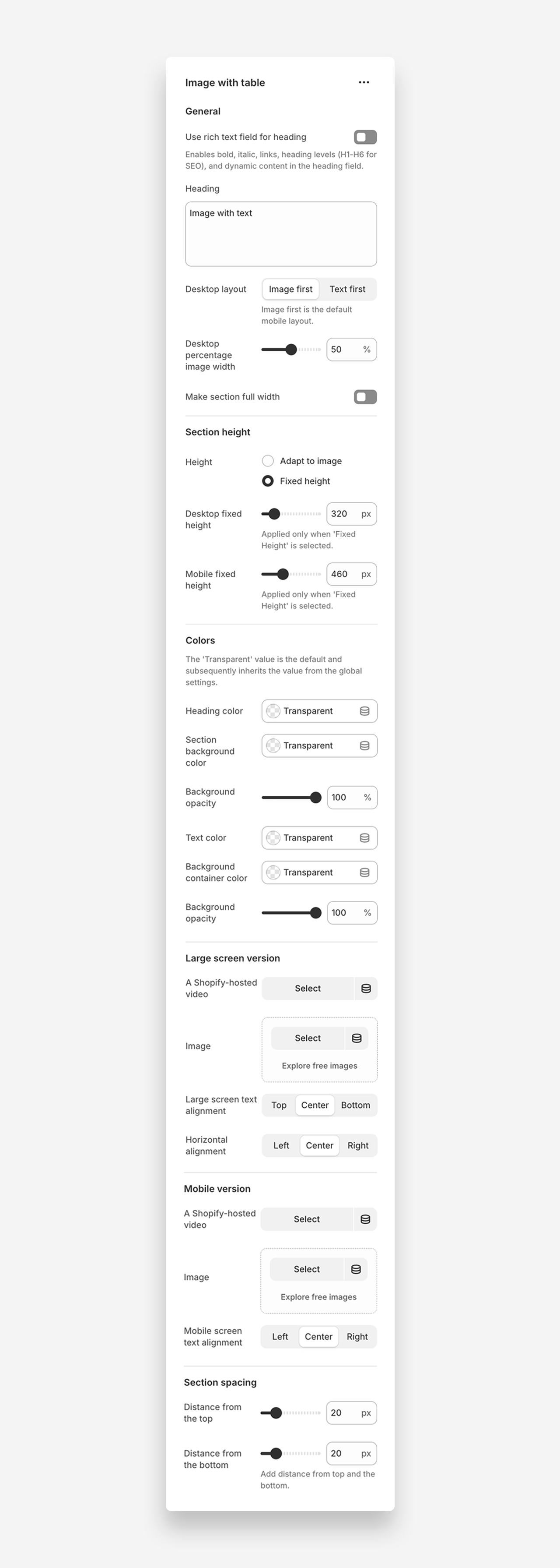 - Large screen text alignment: Choose the alignment of the text on the section for large screens (options: Top, Center, Bottom, Left, Center, Right).