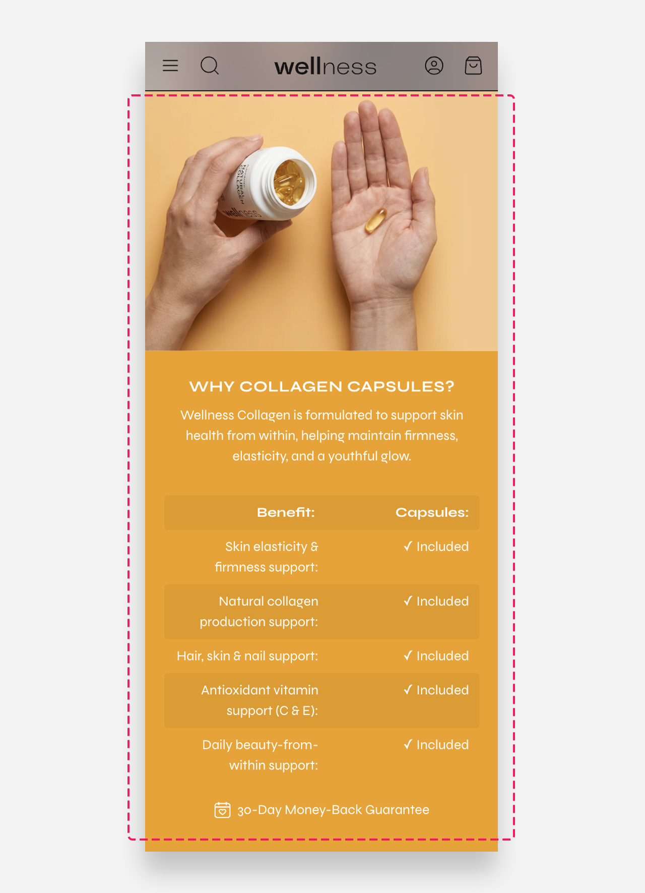 The “Image with table” section pairs an image with text-based content, allowing you to display structured information such as features, details, or specifications next to a visual. The table is created directly using simple text formatting and is limited to two columns, making it ideal for clear, readable layouts without the need for apps or custom code. This section works well for presenting information in an organized, visually balanced way alongside an image.