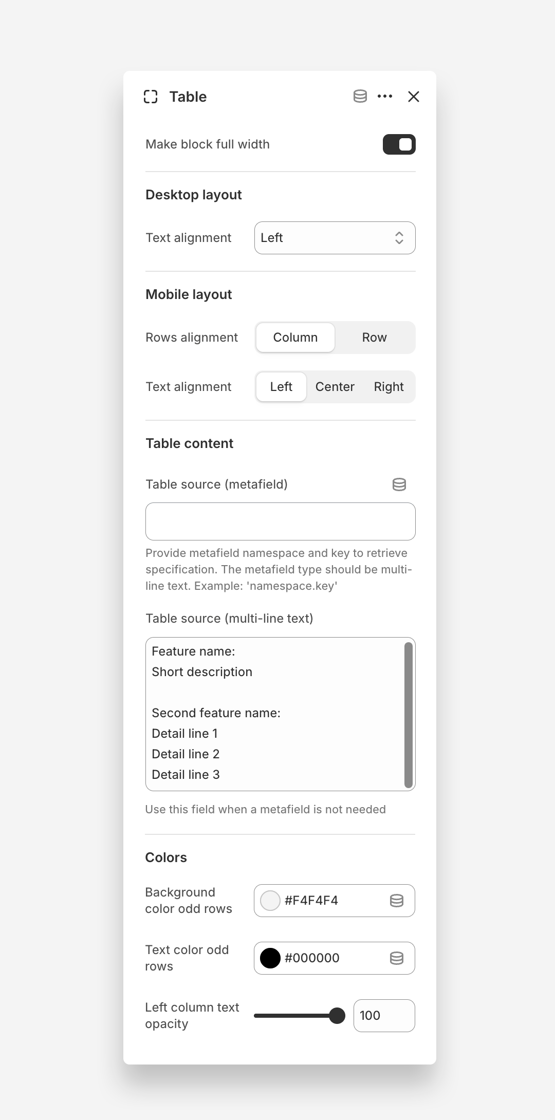 namespace.key. - Table source (multi-line text): Manually enter the table content directly in this field. Use this field when a metafield is not needed. Format each row with a feature name followed by its details on separate lines.