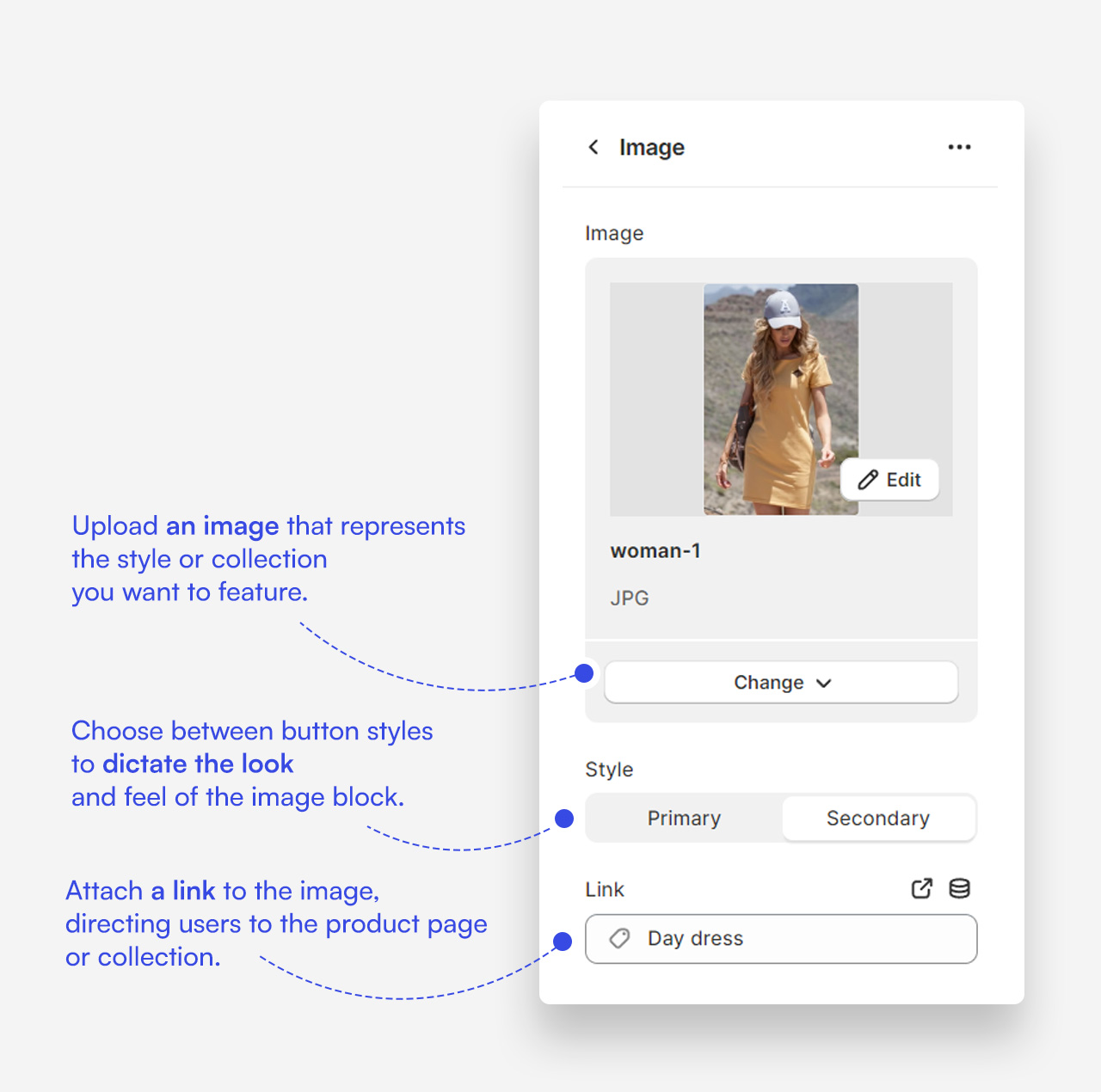 - Style: Offers two styling options for the image block – Primary and Secondary. This determines the visual hierarchy of the image within the Lookbook section, allowing for design flexibility and emphasis where needed.