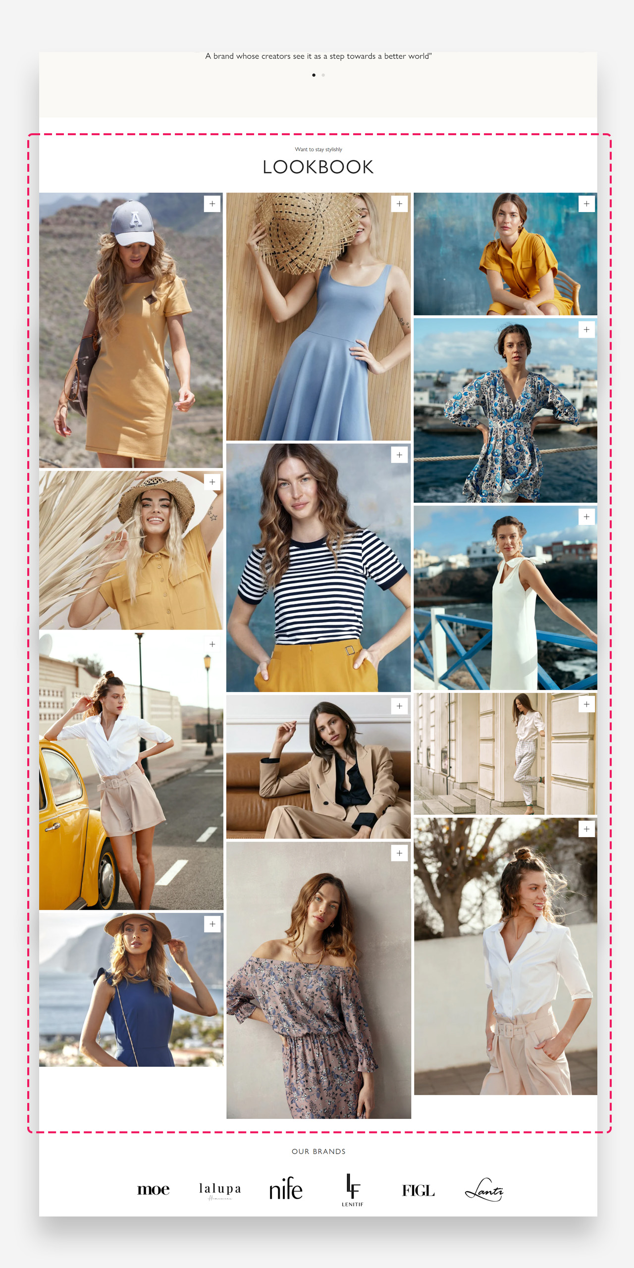 The "Lookbook" section provides an elegant way to feature a collection of images in a clean, organized layout. This visually engaging section can highlight different aspects of a collection, editorial content, or various products in a straightforward yet impactful manner. It's designed to draw attention to specific items or themes, making it a versatile tool for storytelling and product display.