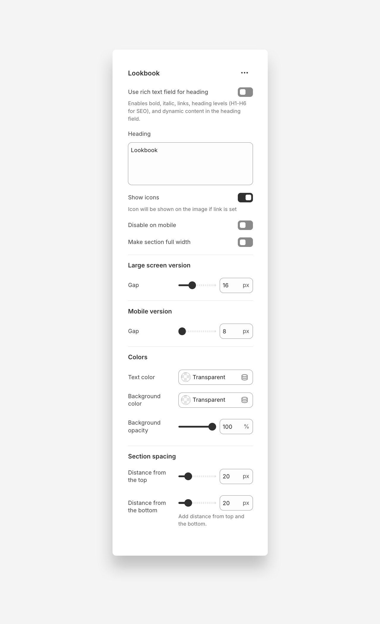 - Gap: Adjust the gap between items in the lookbook on mobile devices.