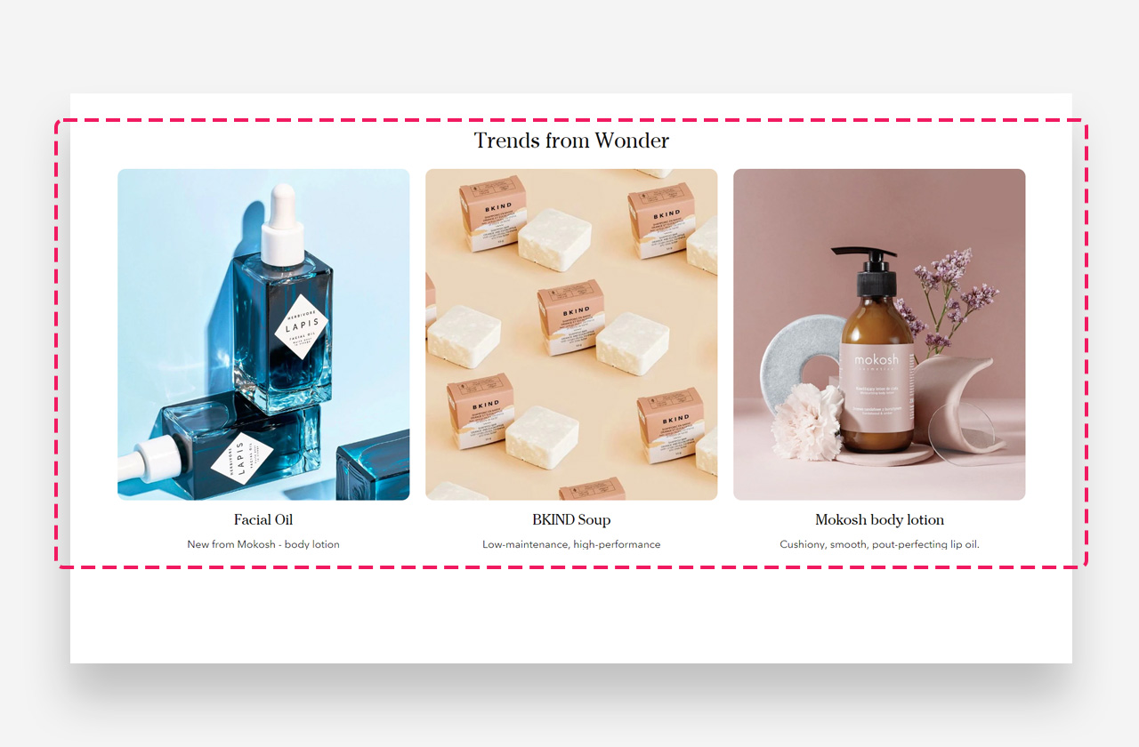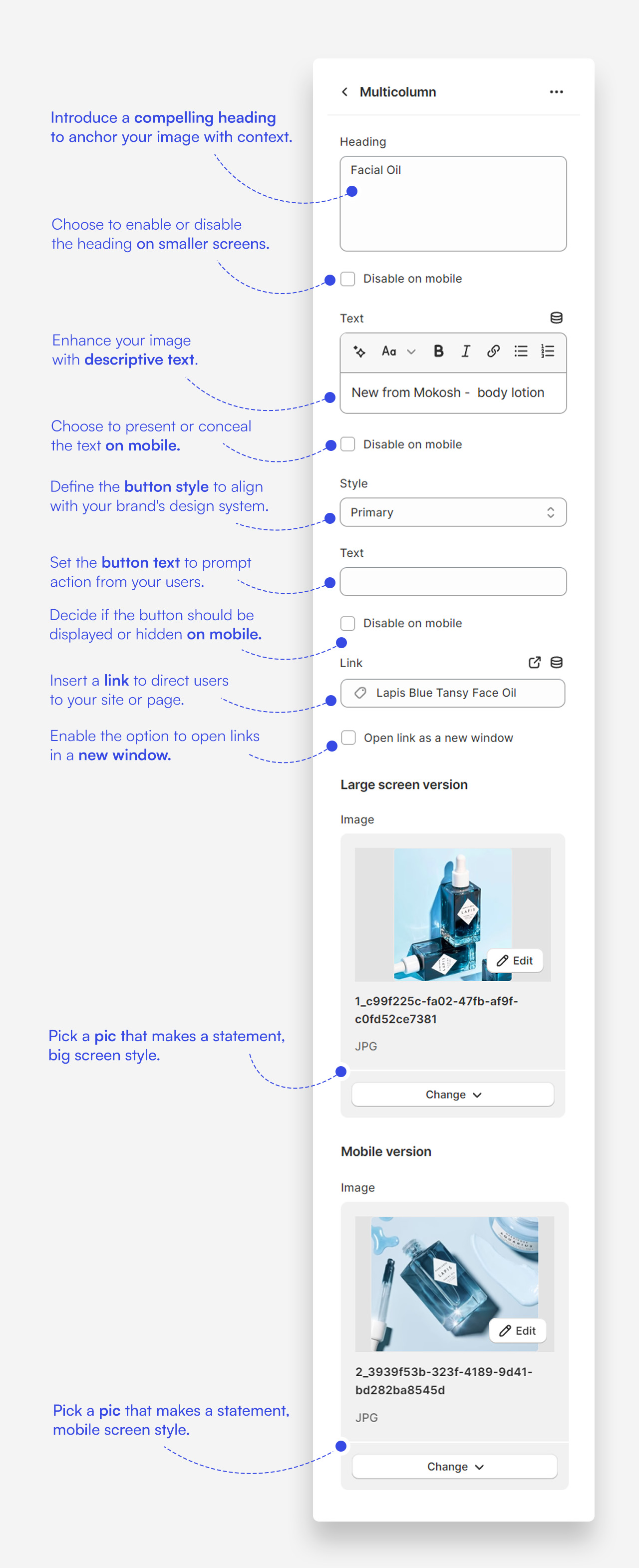 - Text : Input text that complements the image and provides context, such as details on a product, collection, or story.