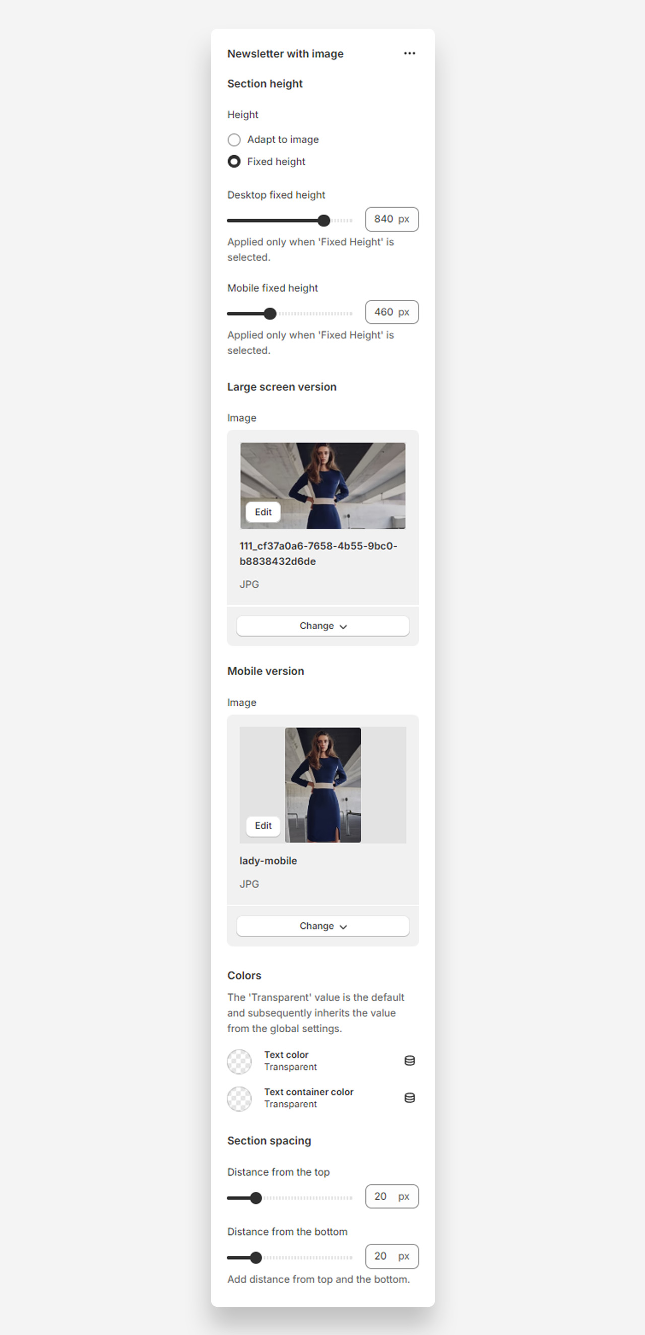 - Height: Choose between adapting the height to the image or setting a fixed height.